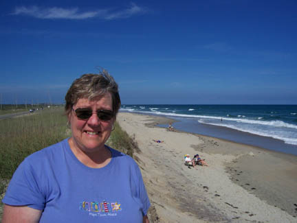The drive to the Outer Banks was very interesting and fun. Shortly after crossing into North Carolina from Virginia the road began to change to more beach like, that is, more rural and then many small shops on a narrow sand dune that seems to go on for mile after mile. Our first stop was the Wright Bros Memorial where the boys flew the frist airplane in 1912. Bev is standing at the exact spot they took off and in the distance you can see where they landed. They flew 4 times that day but it took many years before they turned it into a a financial success.